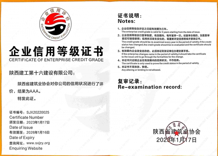 企业信用3A等级证书-公司资质-关于我们-陕西建工第十六建设有限公司